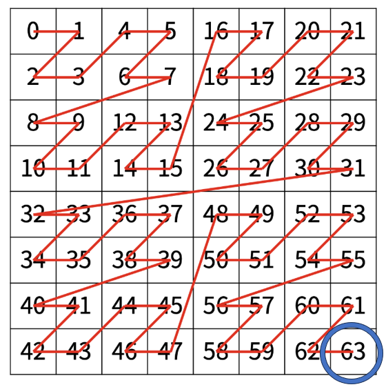 굳이 일일이 세줄 필요없이, 4등분한 사각형이 반복되는 것을 아니까 16*3 를 하고, 첫번째 사각형에서 63과 대응된 위치를 가진 수가 15이니 둘이 더해주면 된다. 그렇다면 15도 일일이 세야할까?