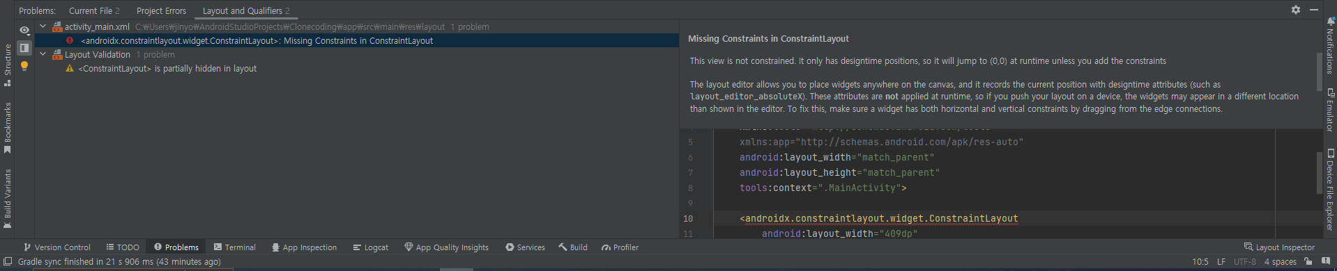 [안드로이드 스튜디오] missing constraints in constraintlayout